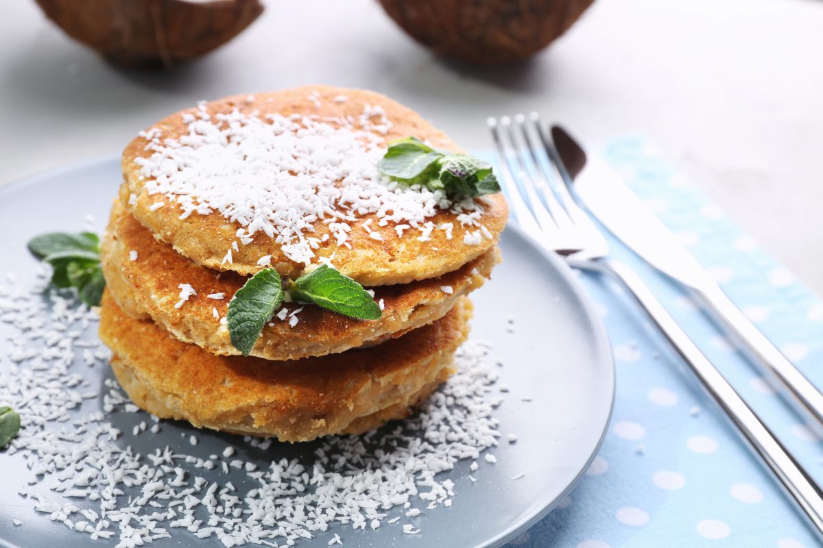 Priprema: U blenderu dobro izmiješajte bananu i jaja. Dodajte kokos u prahu, ekstrakt vanilije i cimet. Ako je smjesa previše rijetka, dodajte još jednu kašiku kokosa u prahu. U tiganj stavite malo kokosovog ulja i sačekajte da se zagrije. Sipajte deblji sloj smjese i pecite palačinku po 3 minuta sa obje strane. Palačinke poslužite prelivene medom i sa nasjeckanim svježim voćem.