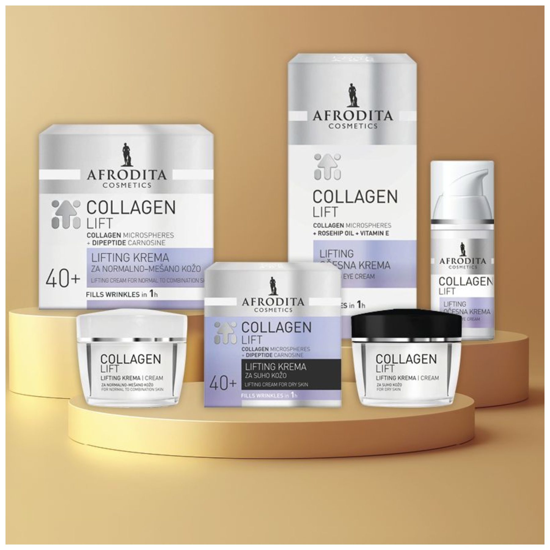 Najnoviji trendovi za ljepotu vraćaju se osnovama. A za lijepu kožu ništa nije osnovnije od njenog osnovnog gradivnog elementa – kolagena. Za više kolagena i manje bora isprobajte novi Afroditin hit COLLAGEN lift! Darujemo kremu za područje oko očiju, kremu za normalni do mješoviti tip kože i kremu za suhu kožu!