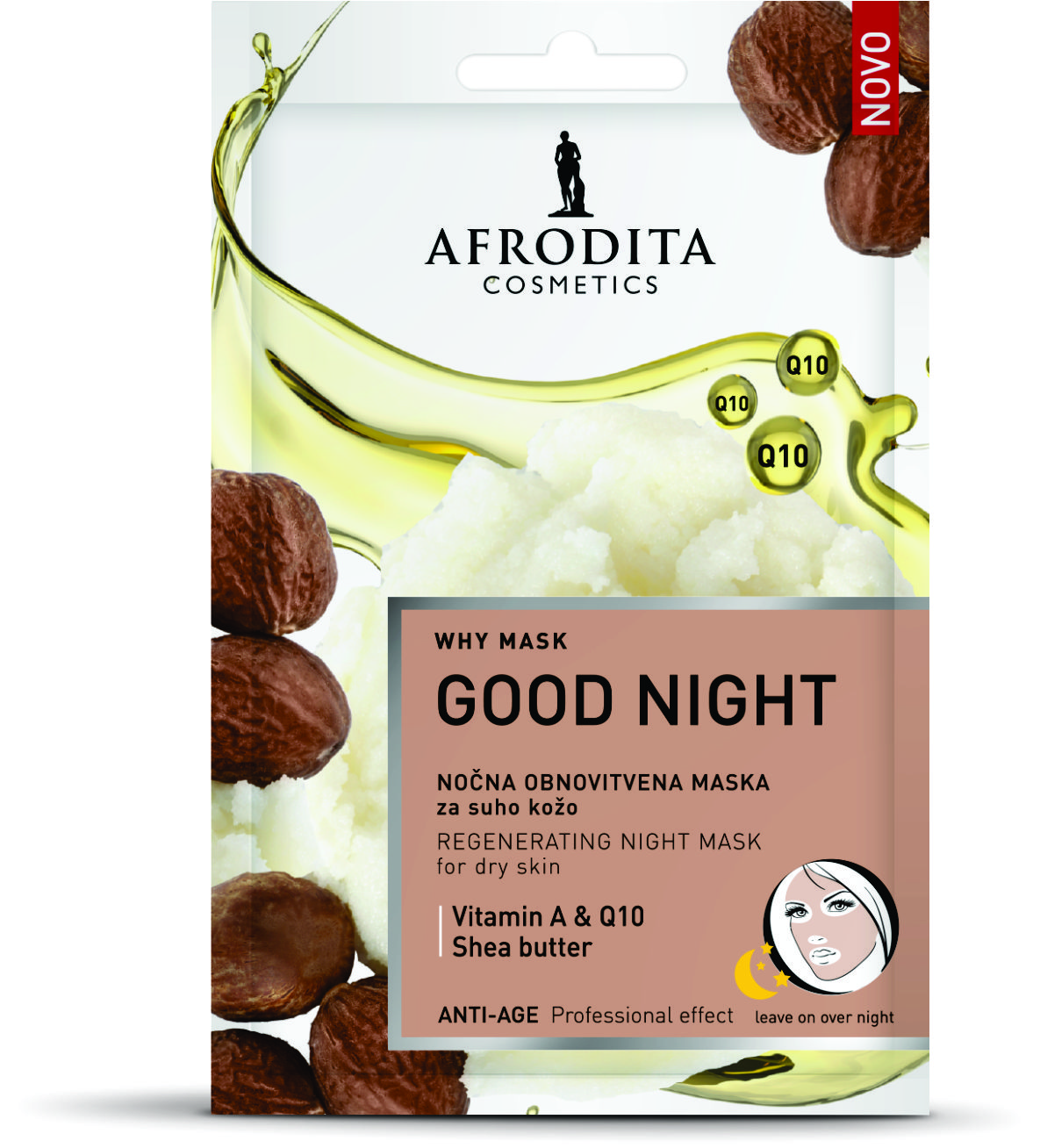 Djelovanje i rezultat upotrebe: Laku noć suhoj, beživotnoj koži; dobro jutro vitalnosti i mladalačkom izgledu! Sa karite maslacem, koenzimom Q10 i vitaminom A suhu i beživotnu kožu izdašno hrani, vraća joj elastičnost i vitalnost. Djeluje tokom noći te se ne ispire.